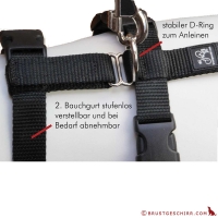 - Der Leinen-Anhängepunkt des NoExit Hundegschirrs ist beim vorderen Bauchgurt, der zweite Bauchgurt dient zur zusätzlich sichernden Fixierung des Geschirrs.