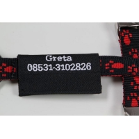 Bitte messen Sie die Breite des Gurtbandes (10, 15, 20 mm usw.) und wählen Sie die entsprechende Bandbreite im Bestellvorgang aus. Achten Sie auch auf den verfügbaren Platz um das Namenslogo auf dem Rückensteg des Geschirrs oder Halsband anzubringen.