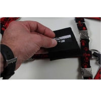 Das Logo wird auf dem Rückensteg des Geschirres mit Hilfe eines Klettverschlusses befestigt. Es kann zusammen mit dem Geschirr in der Waschmaschine bei 30 Grad gewaschen werden.